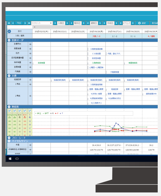 それぞれの日付の下には、どのような検査や処方を行ったのかなど、大まかな診察・治療の内容が表示され外来と入院を一画面上に時系列で確認することができます。 - 縦軸の項目は自由に設定でき、検査、処方、リハビリ、栄養指導など診察に必要な情報をセットしておけば、情報を探す手間も見落とす心配もなくなります。