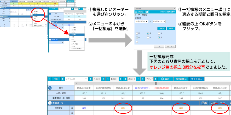 - 定期的に行う検査や処置、看護処置などは、オーダー一括複写が便利です。
