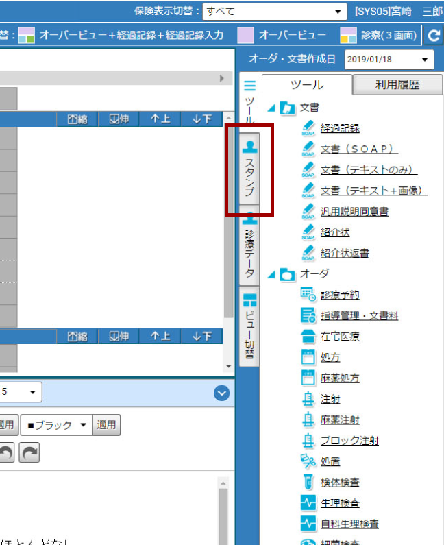 画面右側にある「スタンプボックス」より、オーバービュー画面へのドラッグ&ドロップするだけでオーダーが完了します。 - 自分自身だけが利用可能な「マイスタンプ」や、院内共通で利用可能な「部位別」「科別」等に分けておくこともできます。